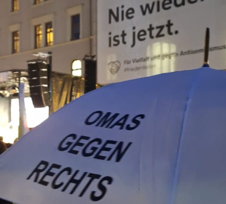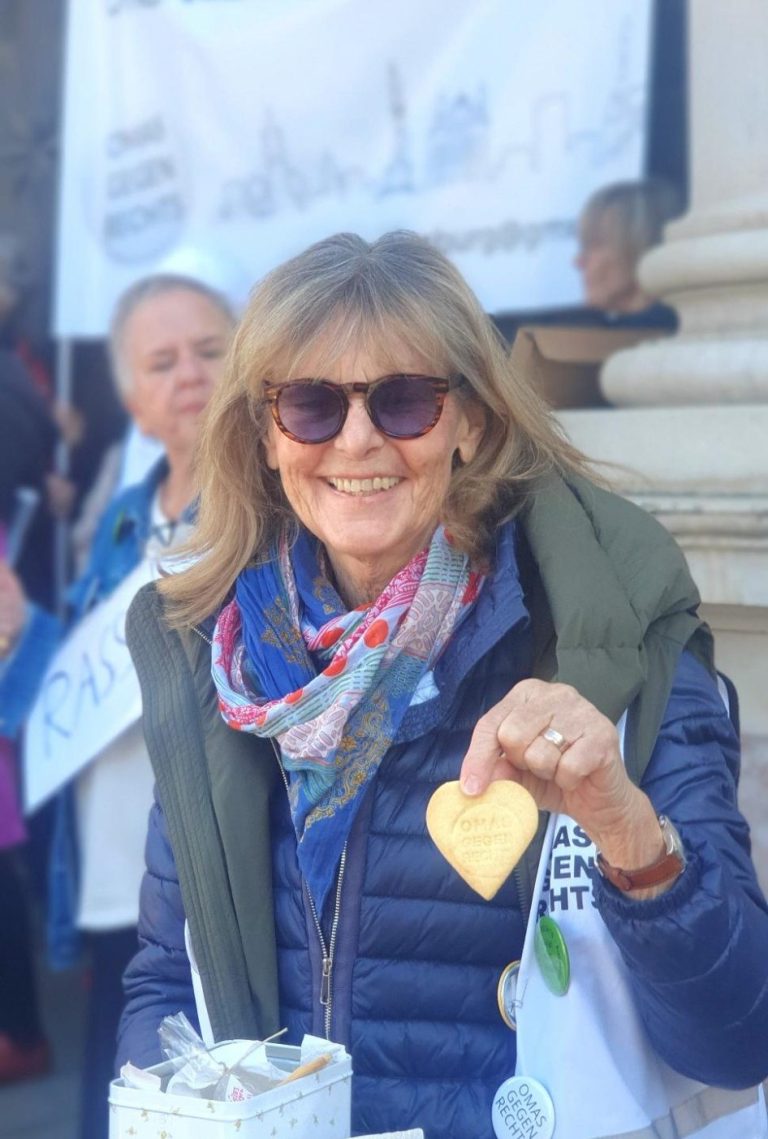„Ich sehe mit großer Sorge, dass unsere freiheitlich-demokratische Grundordnung zunehmend in Frage gestellt wird und immer mehr Menschen rechtsextreme Positionen teilen. Dem kann und will ich nicht tatenlos zuschauen. Wenn wir nicht in einer Welt leben wollen, in der Hass, Hetze und menschenverachtende Parolen zur Normalität werden, ist Widerstand Pflicht! Daher hab ich mich den OMAS GEGEN RECHTS angeschlossen und daher geh ich auf die Straße. NUR GEMEINSAM SIND WIR STARK!“